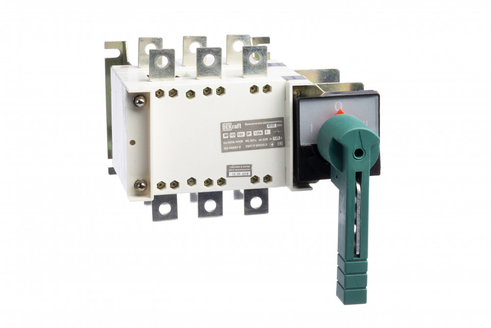 Выключатель-разъединитель серии ВР-101 DEKraft; 3P; реверсивный, тип Т (Тандем); номинальный ток 250 А; типоразмер 250; ном.напряжение до 690 В, 50 Гц; категория применения - АС-22В (смешанные активные и индуктивные нагрузки). Двойной разрыв контактов обеспечивает надежное гашение дуги и снижает риск повреждений. Подвод питания возможен как сверху, так и снизу аппарата. Медные клеммы обеспечивают высокую электрическую проводимость и удобство подключения проводников.