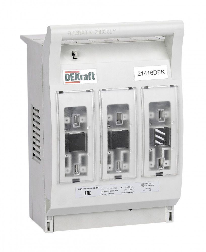 Предохранитель-выключатель-разъединитель горизонтальный (ПВР-102) предназначен для включения и отключения нагрузки с видимым разрывом в сетях трехфазного переменного тока до 250 А частотой 50/60 Гц и номинальным напряжением до 690 В. Трехфазное отключение, навесной монтаж на шины.
