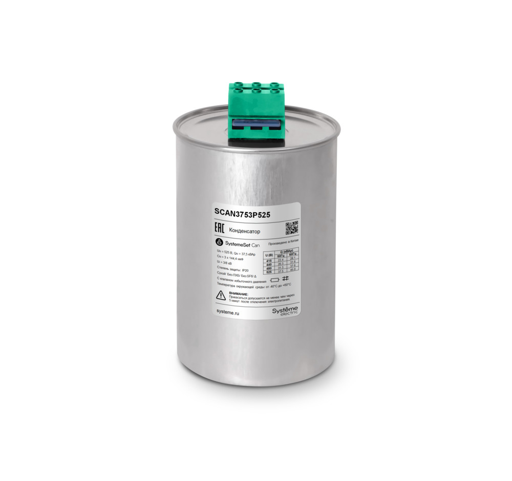 Низковольтный трёхфазный конденсатор торговой марки Systeme Electric серии SystemeSet типа Can; номинальная мощность 37,5 кВАр, номинальное напряжение 525В; температура окружающей среды от -40°C до +60°C; Ф136; длительно выдерживаемый ток 2In; максимальный пусковой ток 400In; степень защиты IP20; цилиндр из экструдированного алюминия, металлизированная полипропиленовая плёнка со свойствами самовосстановления; сухая биоразлагаемая смола, без ПХБ, без SF6; встроенный разрядный резистор; предохранитель с мембраной избыточного давления