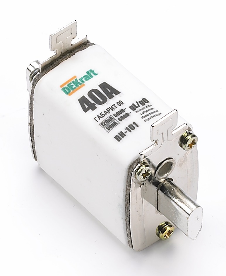 Предохранитель ножевой серии ПН-101 DEKraft; тип 33; габарит 00; ном. ток 100 А. Предохранители ножевые применяются в однофазных и трехфазных сетях переменного тока, напряжением до 660 В, частотой 50 Гц. Они представляют собой наиболее компактные и экономичные устройства защиты электрических цепей и кабельных линий от перегрузки и короткого замыкания. Индикатор состояния позволяет быть уверенным в защите электрооборудования.