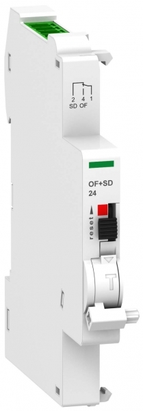 iOF+SD24 доп. устр. сигнализации (Ti24) для C60,C120,C60H-D. Вспомогательные электрические устройства используются совместно с аппаратами Multi9 и специальными сериями автоматических выключателей C120 и С60H-DC. Они устанавливаются защёлкиванием слева от соответствующего аппарата. Вспомогательное устройство iOF/SD24 может передавать данные о состоянии контакта или об аварийном отключении устройства SD на Acti 9 Smartlink или на программируемый логический контроллер через интерфейс Ti24.