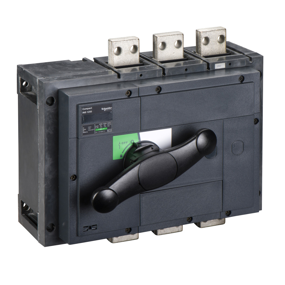 Выключатель-разъединитель серии Compact INS Schneider Electric, 3-полюсный; номинальный ток 1250 А; тип управления Черная поворотная рукоятка; исполнение - стационарный; монтаж - DIN-рейка, панель; ВхШхГ - 300x340x146.5 мм.